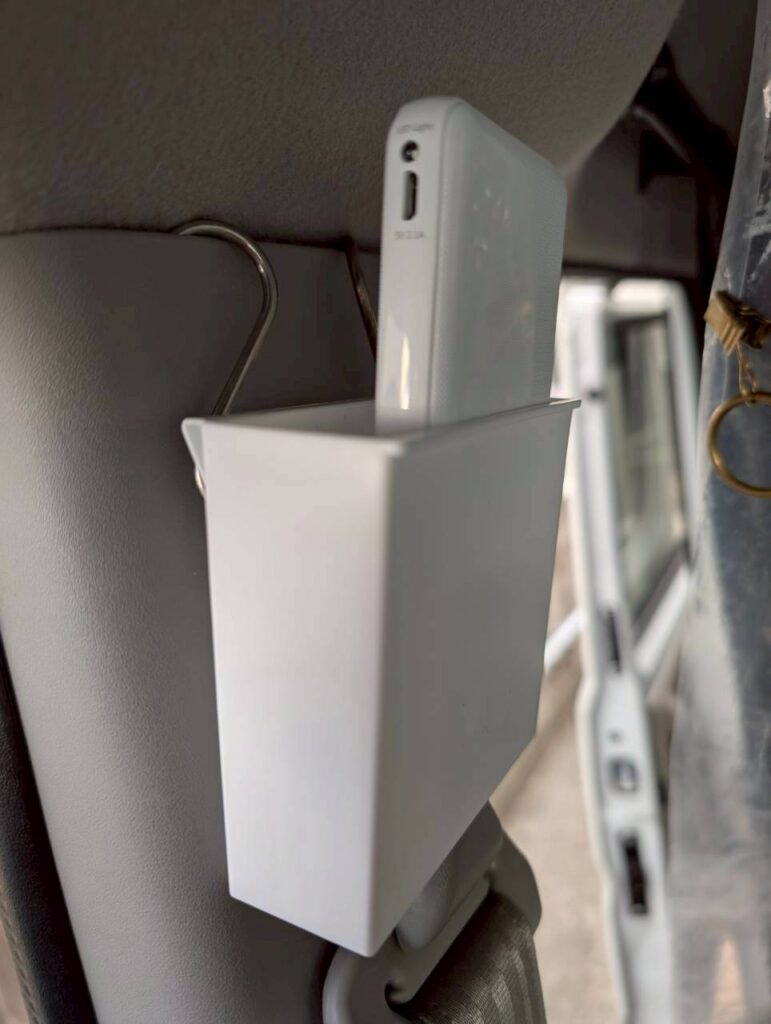 図には書いていませんが、助手席側には二段ベッドがあり、だいたいリアゲート側を頭にして寝るためモバイルバッテリーが手で触れる位置に欲しいのです。
