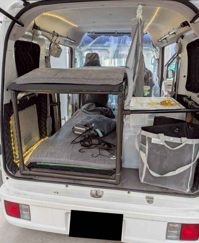 なめくじはホワイト1mとウォームホワイト1mの手元在庫があったので、運転席だけホワイトにして、リラックスしたい荷室側のライトはウォームホワイトで統一しました。