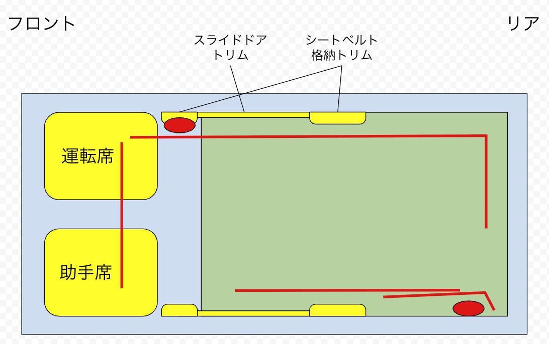 図には書いていませんが、助手席側には二段ベッドがあり、だいたいリアゲート側を頭にして寝るためモバイルバッテリーが手で触れる位置に欲しいのです。