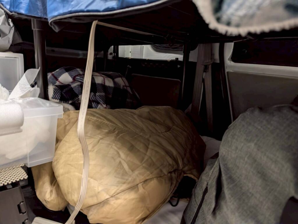 前回記事とは違って今回は夫婦車中泊なので、ちゃんと二段ベッドを立てて活用します。