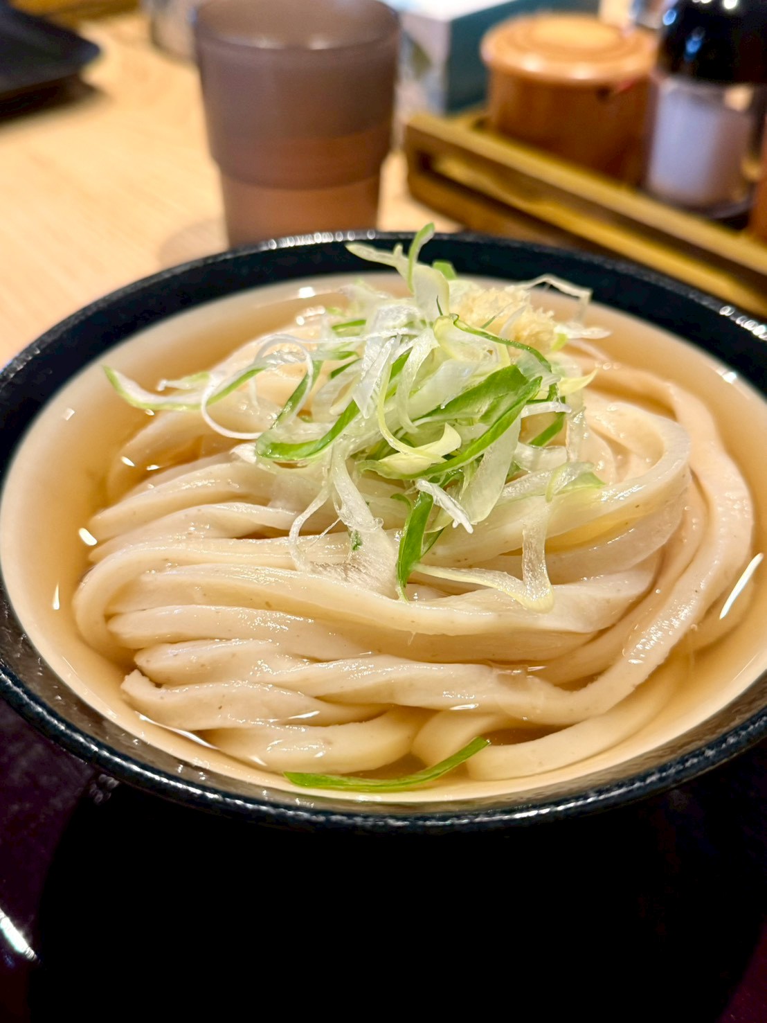 10分くらいしたらできあがったうどんを取りに行って、セルフでネギ天かす生姜をトッピング。