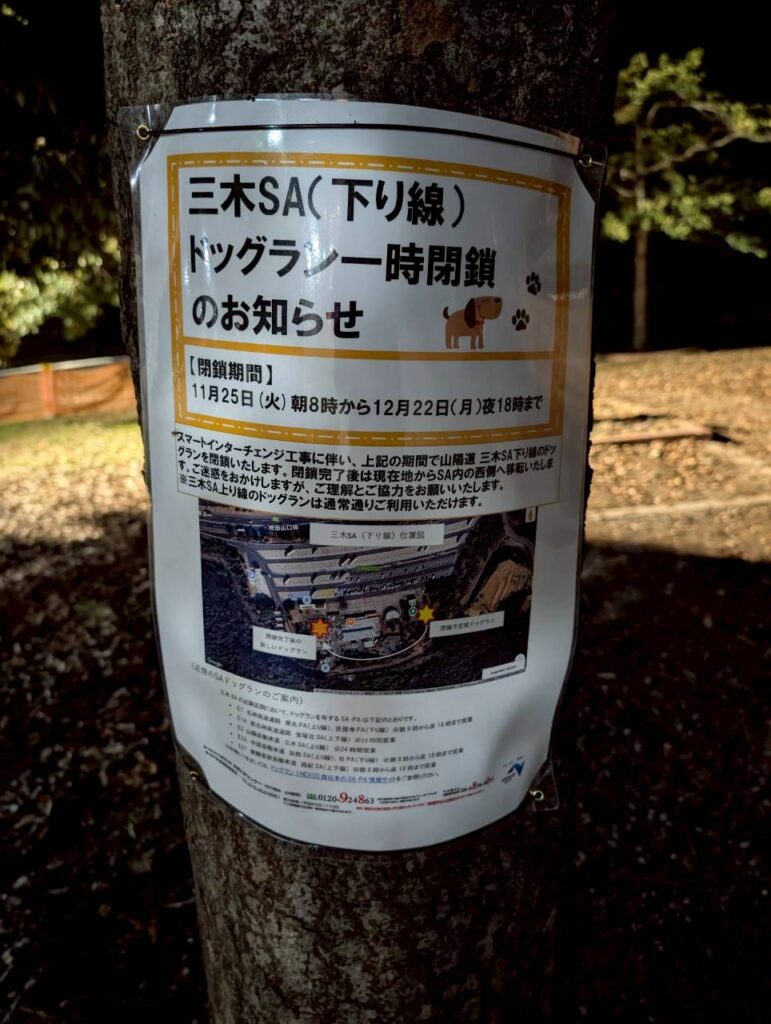 2025/12/22(月)18時まで工事のためドッグランは閉鎖、移設後は同じSA内西側の土地にドッグランが出来るようです。
