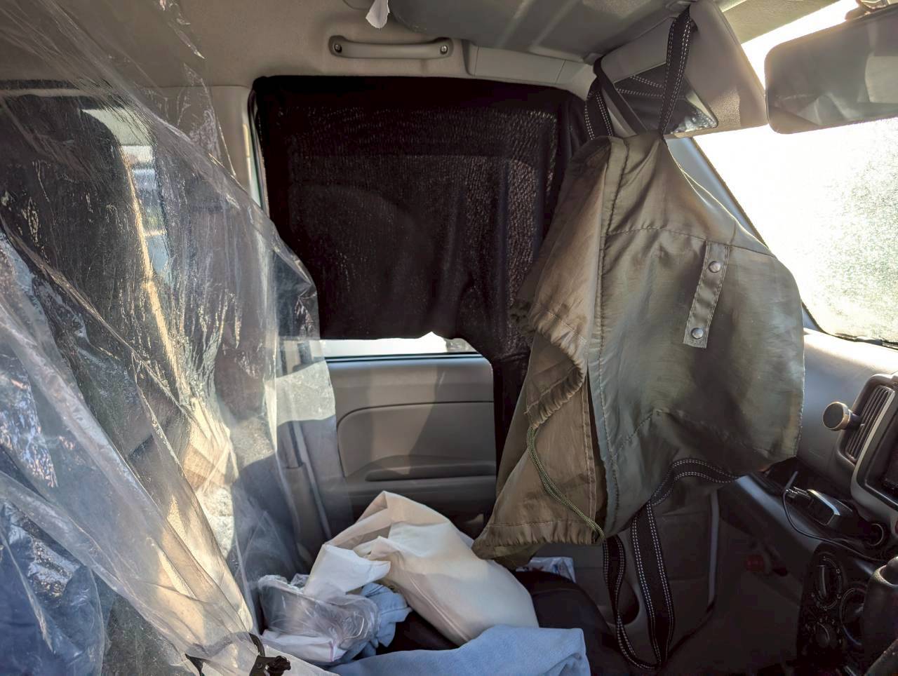 ということでなんとか車にある素材で必死に目隠しをします。