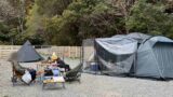 付属のインナーテントは奥行き80cmと1人用なので、ソロキャンプか別のテントなどで使いましょう。