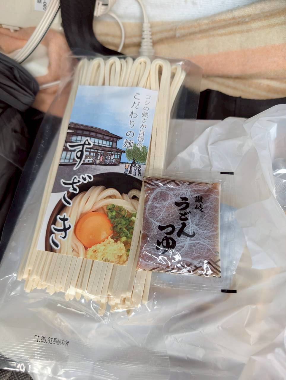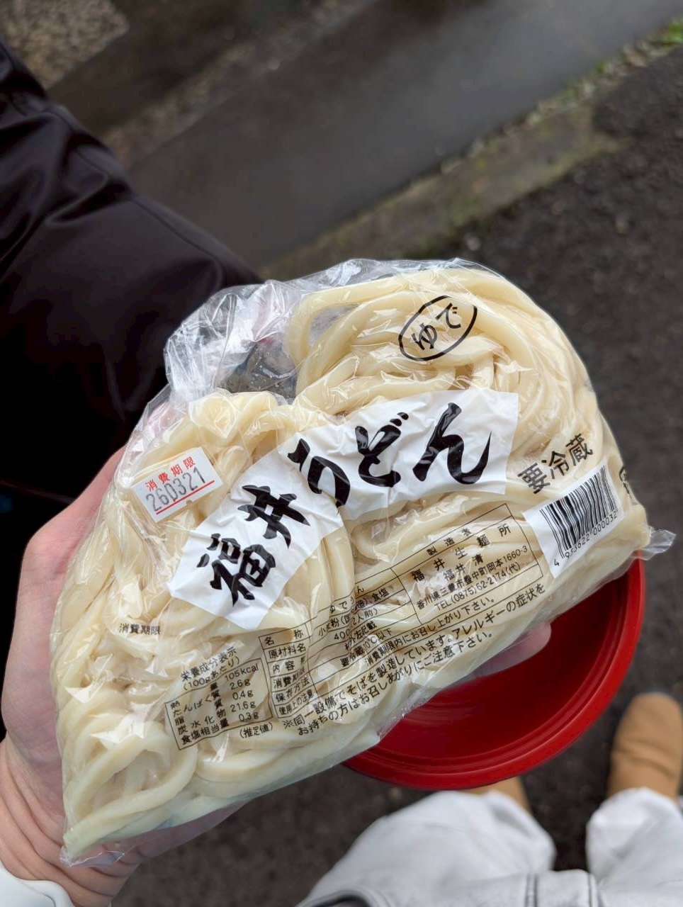 下調べで見た動画では茹でたてのうどんが提供されていたのですが、我々が訪問した時間帯のせいか販売方法が変わったのか、茹で済みで常温に冷えた袋麺(¥175/2玉)を販売という形でした。