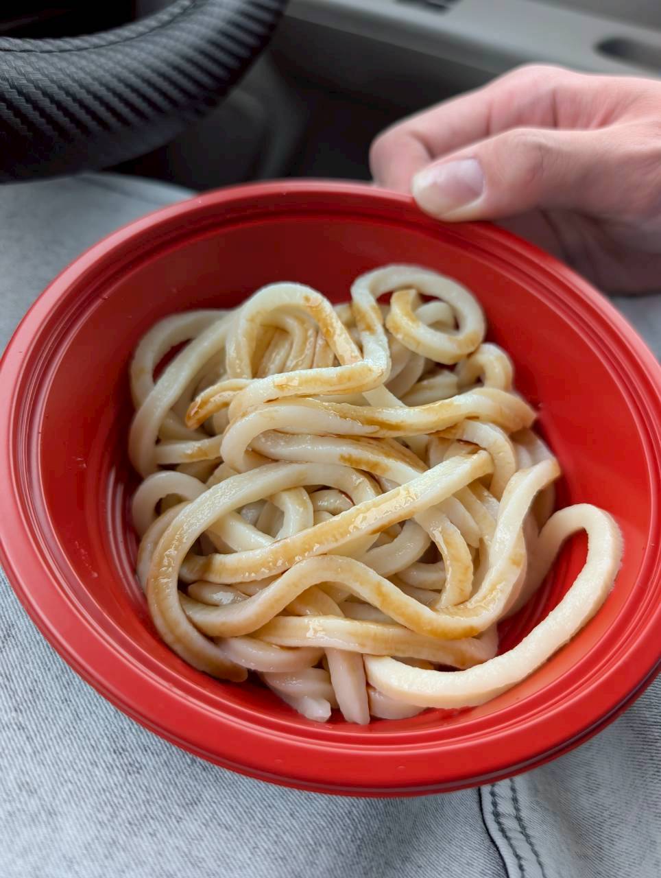 持参した醤油をかけて早速いただきましたが、期待の低さを裏切るまさかのうどんでびっくり!