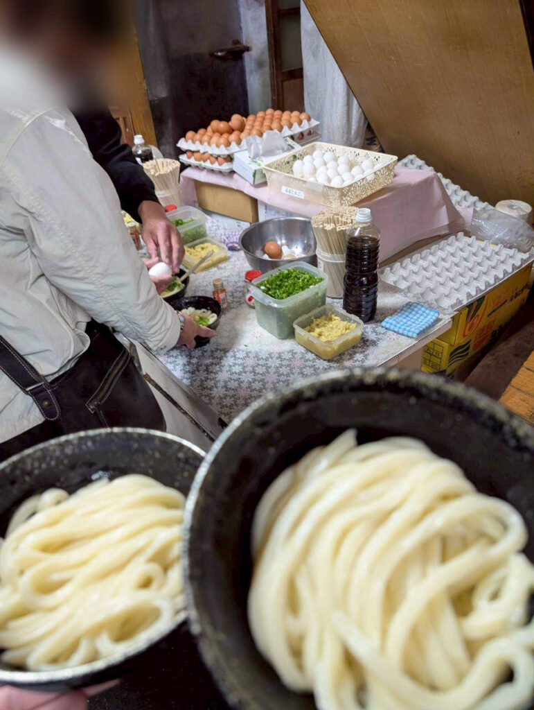 順番が来たらサッとうどんを渡されるので、そのまま店内で生卵(¥60)と温泉卵(¥100)を1個ずつ、ネギとしょうが、味の素としょうゆを少々トッピング。