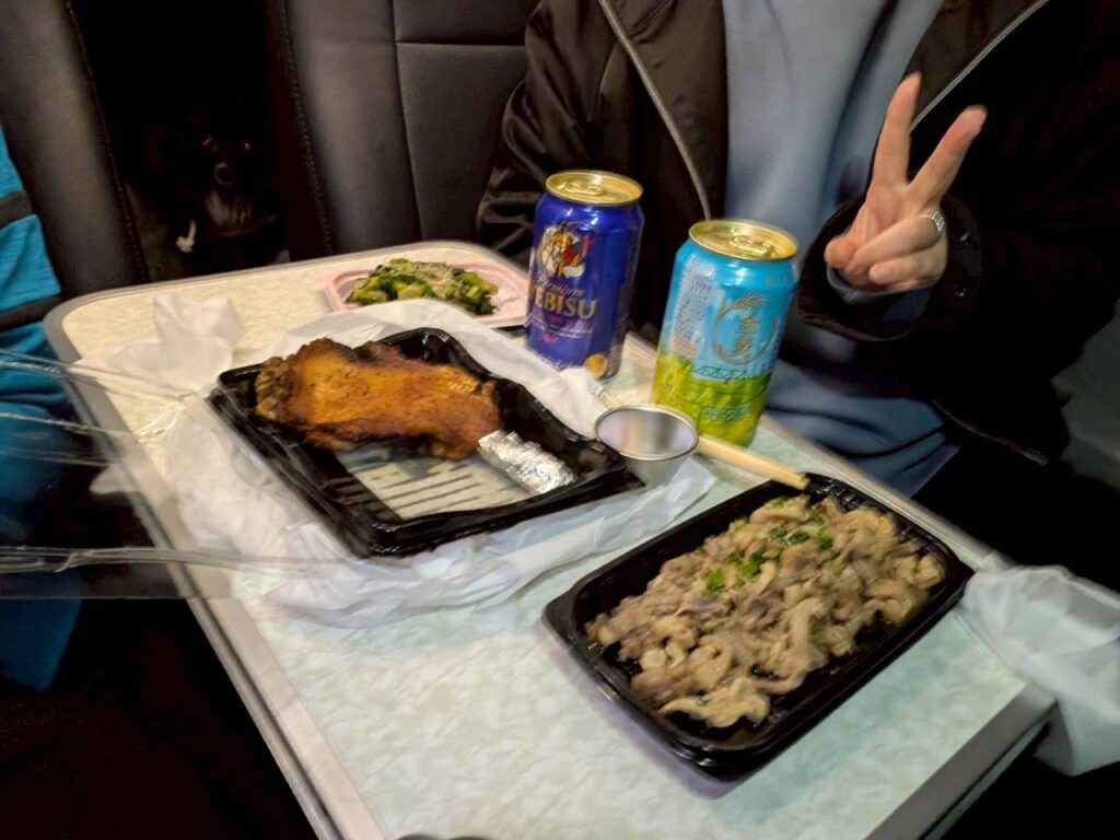 さて車の荷室はベッドモードになっておりスペースがないため、工夫してキャビンへ机を置いて夕飯タイムです。