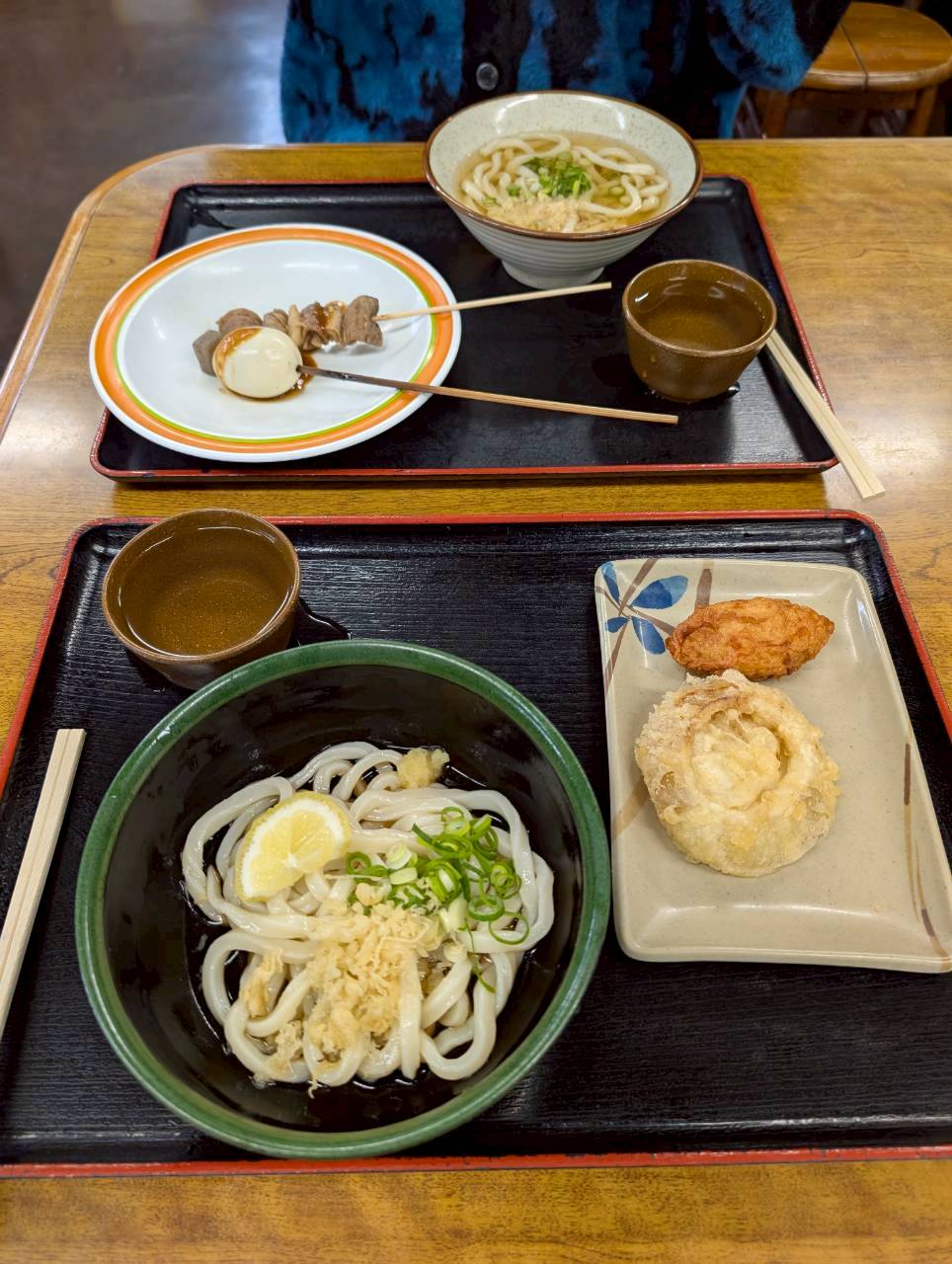 今回はかけうどん小(¥310)の温とぶっかけうどん小(¥330)の冷、それにおでんと天ぷら2種をチョイス。
