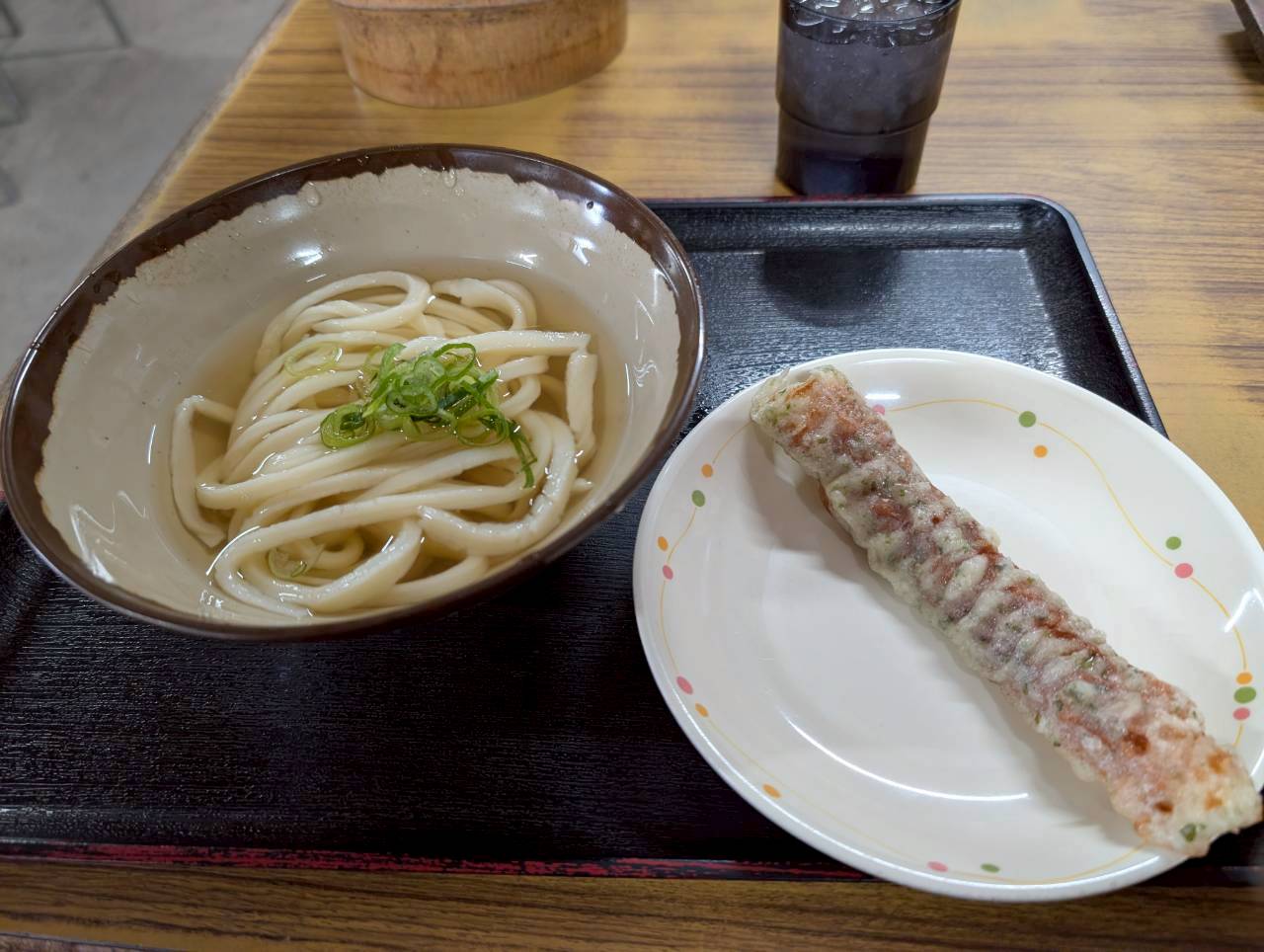 さて山内うどんさんは回転がめちゃ速いため、開店して5分くらいで入店して早速ひやひやのかけうどん小(¥250)とちく天(値段失念)を注文します。