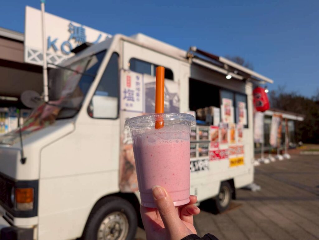 お土産も買いつつ、塩キャラメルソフトクリームが売り切れということで奥さんがいちごスムージー的なものでクエストを消化。