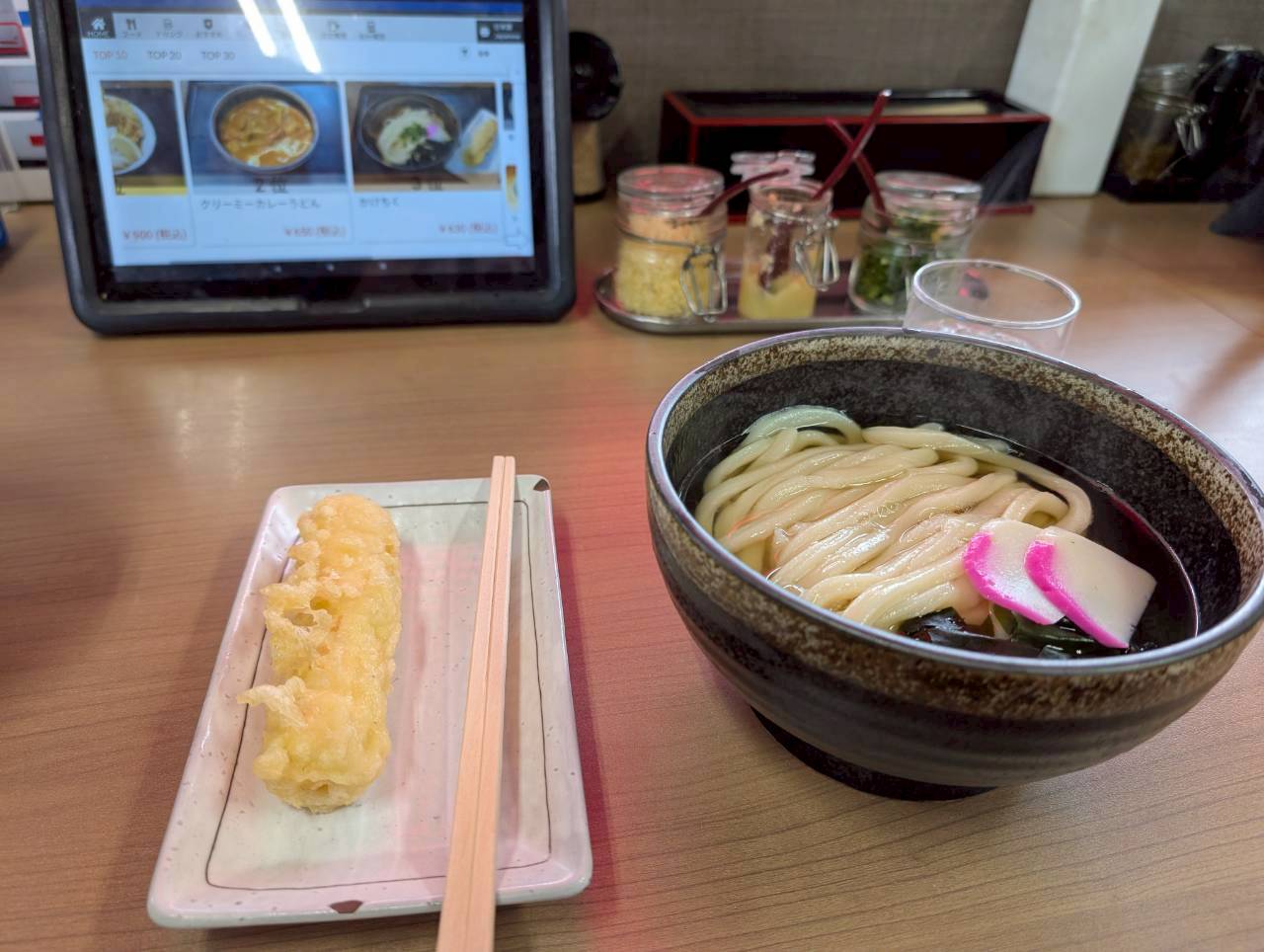 注文するのは温かいかけうどん小(¥360)と冷たいかけうどん中(¥480)、それにちくわ天(¥150)です。