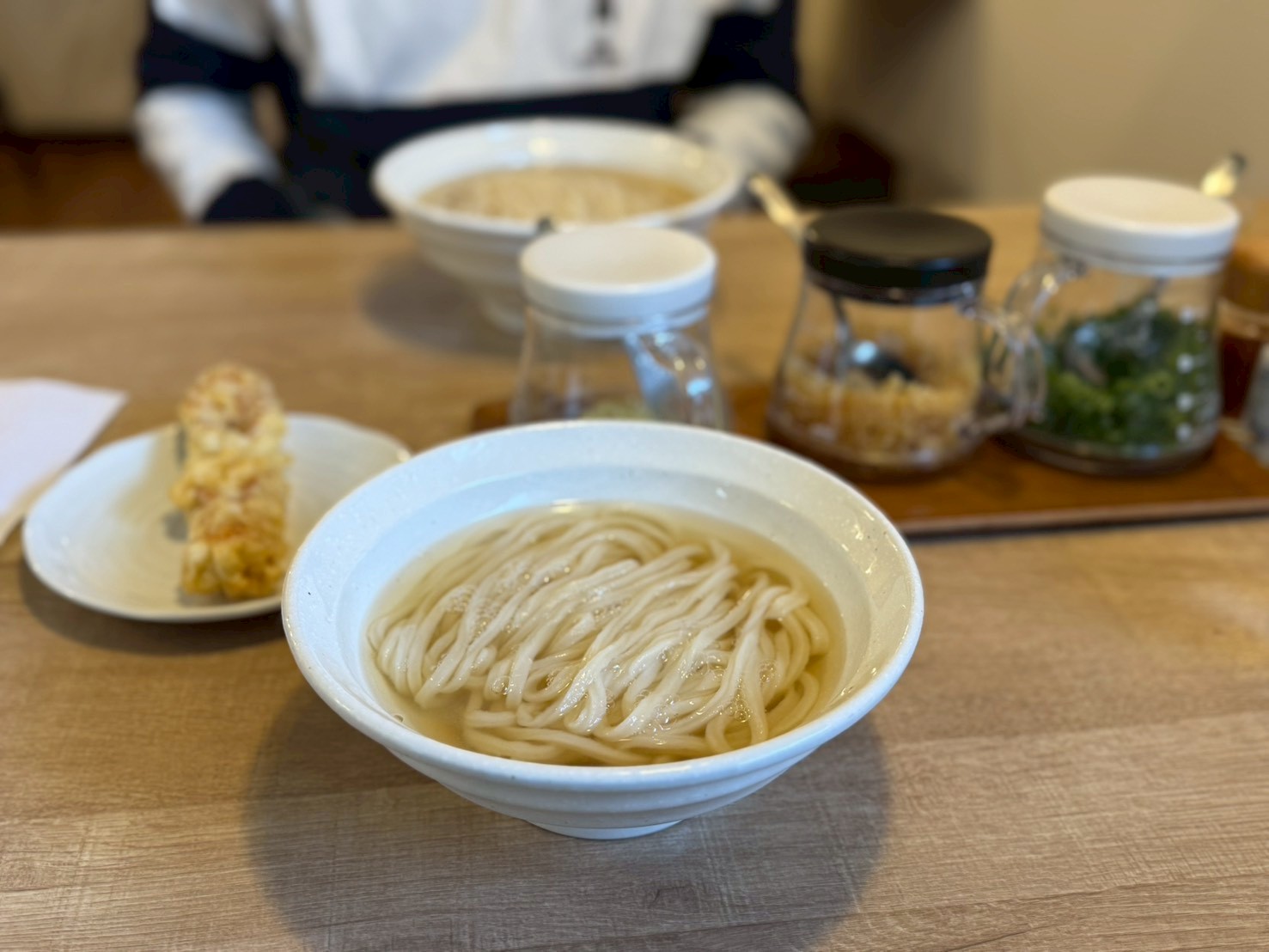 かけの出汁は昆布メインの関西風で、我々からすると懐かしさを感じる味わいですが、麺が決定的に違うので違和感を楽しむことができます。